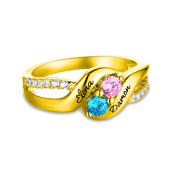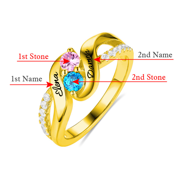 A stylish and meaningful addition to your jewelry box, our beautiful Double Birthstones Ring makes the perfect couple’s ring or family ring. Engraved with up to two names or meaningful words, it includes two sparkling stones in the colors of your choice. Made of gleaming 18k gold plate over sterling silver, it is also available in your choice of sterling silver or 18k rose gold plated sterling silver .