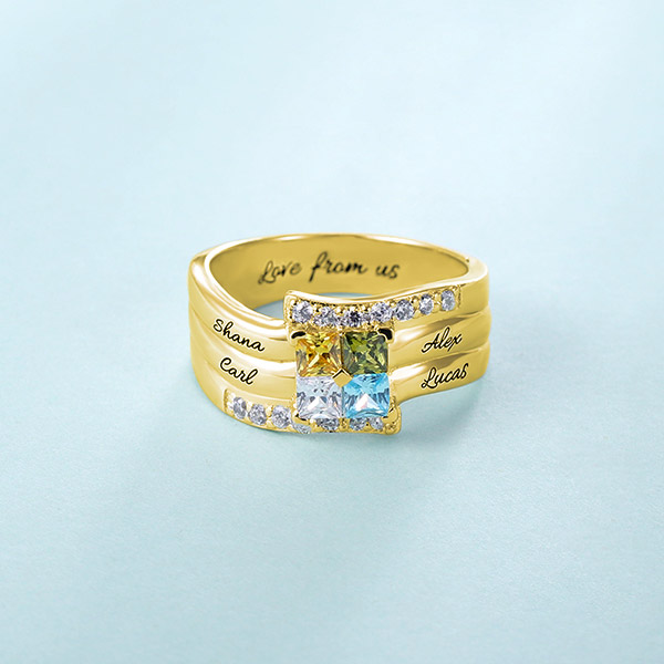 This Personalized Four Square Gemstone Ring  is handcrafted of 925 sterling silver with a double curved row and set with four cubic zirconia birthstones. This ring celebrates the 'fours' and can symbolize the members of your family or four special friends. Selecting your favorite gemstones and customized with a meaningful message and metal color as a perfect gift to you loved one. . This engraved gift is perfect to celebrate an anniversary, Mother's Day, and many other special occasions.