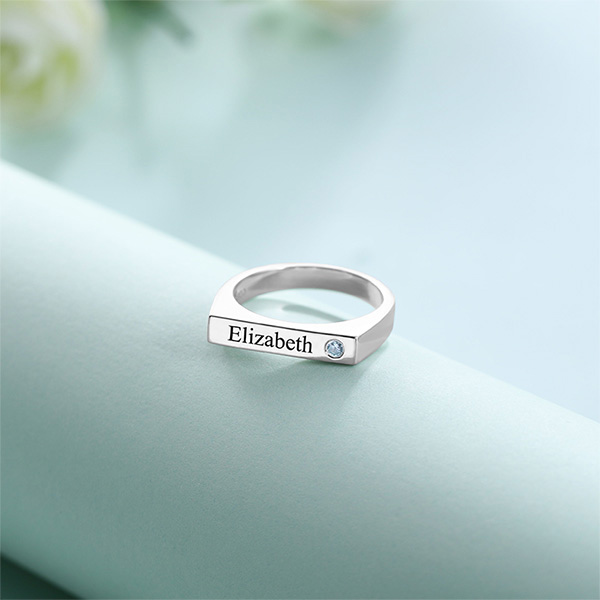 Looking for something extra special to accessorize with? Or maybe you are on the hunt for a really thoughtful present for a loved one in your life? Then you have got to check out this gorgeous bar ring. The design of bar cross section is very special for a ring. It is simple but fashion, the polish on them is exquisite. Our bar ring can engrave everything from names and nicknames to favorite words(up to 10 characters)you want to on it and birthstone is also optional. Can not miss out bar collection!