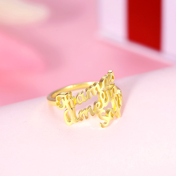 Features three Carrie-style names of your choice, this lovely name ring perfectly performs an intimate relationship through tightly connecting your names. No extra decoration, the appearance of this ring depends on names, which focus more on you and your loved ones. Now, enter names and convey your love in a stylish way.