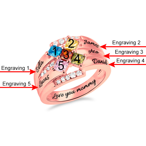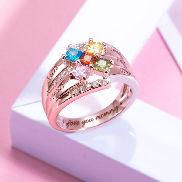 Celebrate your love and faith with this colorful birthstone ring. Make up by five square-shaped birthstones and three individual rings, this stunning ring is a great way to personalized your own statement jewellery. Its shining and exquisite appearance is design for people who want to show their own unique style. Now, choose your most fascinated color and meaningful words or names, let this ring shimmers only for you.