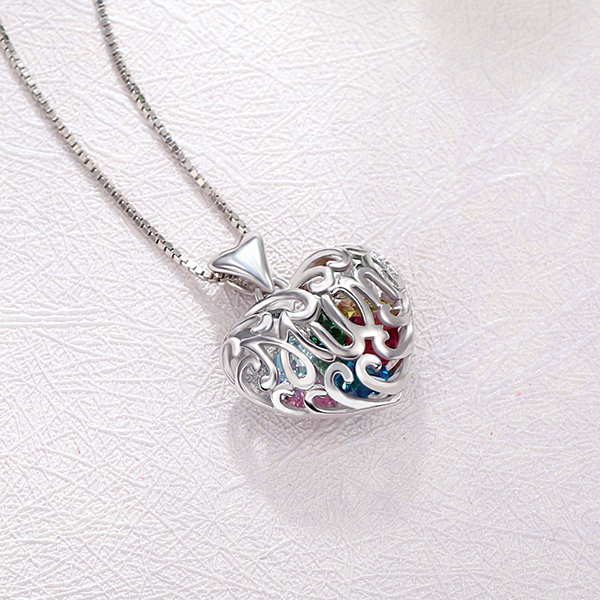 This mother's filigree heart-shaped pendant can be personalized with one to eight 4.0 mm birthstones of your choice, floating within the pendant's cage design.The words, "Mum" are spelled out on the front of the pendant and become part of the confine. This necklace is perfect for a mother or grandmother to hold the birthstones of their loved ones.Exquisite handwork in 925 sterling silver. It's the perfect gift for Mother's Day.
