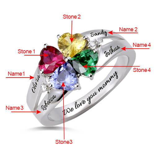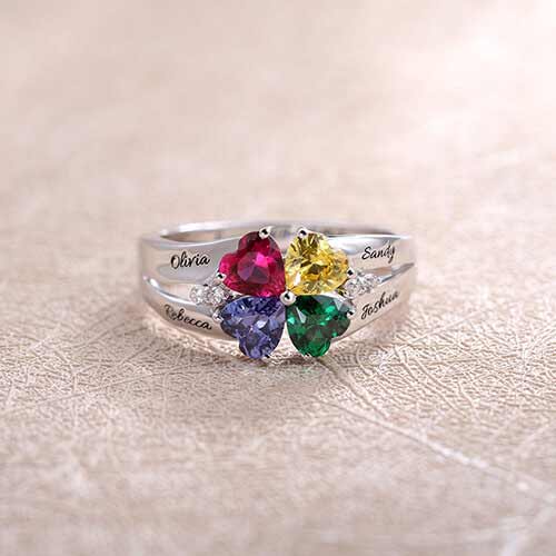 Celebrate family with this Four Heart Birthstone Ring for mom. Creating the lovely style in 925 sterling silver, four birthstones color of your choice and four heart shape cubic zirconia form lucky Four Leaf Clover.Symbolizing your and your family members together forever. Glittering cubic zirconia present a stunning accent along the curved shank. personalized to fit your family, the shank can be engraved with four names, up to 10 characters and spaces each, elegantly written in script.Inside the Ring band, you can choice engraved up to 18 characters any date, name or special words as your need. Please see the alternate image for correct stone and name placement. Polished to a brilliant shine, it's a ring Mom will be delighted to wear.This is a lovely way to celebrate your family's bond, or give Mom this distinctive mother jewelry gift to tell her just how much she means to you. don't wait. Order now!