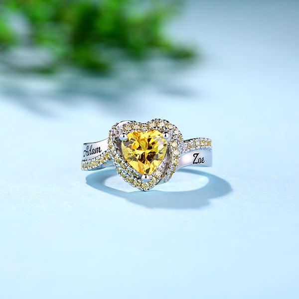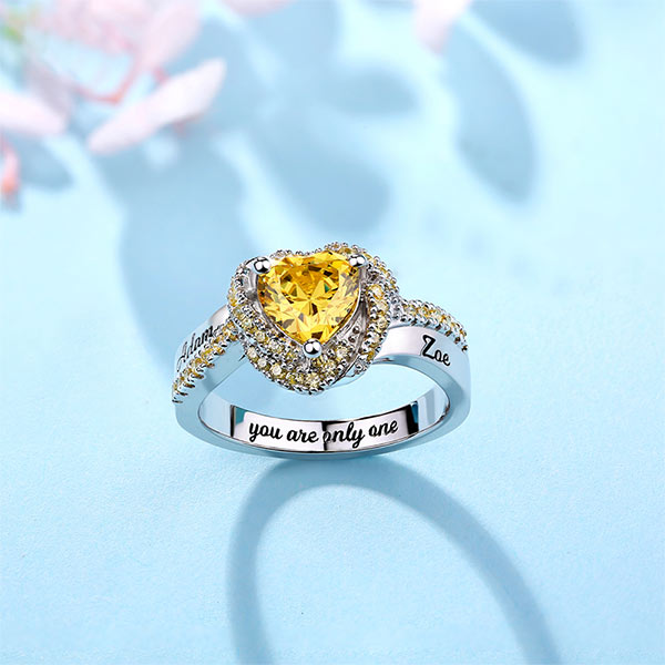 Romantically brilliant, this Engraved Heart Birthstone Garland Ring is handcrafted with heart-shaped main stone surrounded by garland floral-inspired accents set in enduring platinum. It symbolize the unfailing care for the true love. Stylish for young ladies and certainly suitable for any occasion. Personalize it with engraving contents you like.