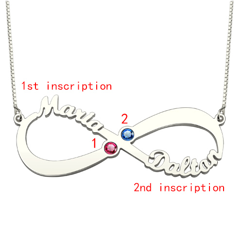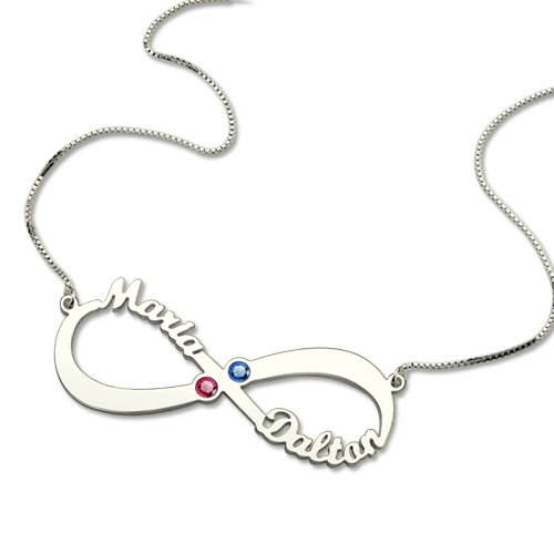 Be the envy of everyone you meet as you declare your forever love for all to see with the incomparable Infinity Name Necklace with Birthstones.Honor your infinite love with this stylish couple's necklace.This sterling silver necklace hangs from a box chain and can be set with two names of your choice to be set on either side of the infinity symbol.