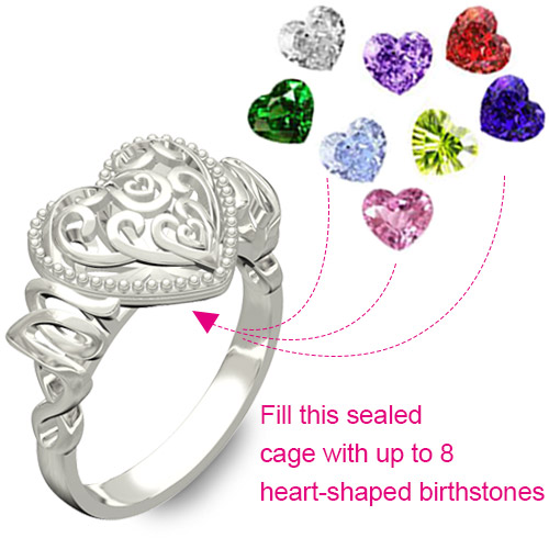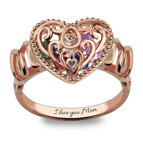MOM letters designed a heart cage ring, The large cage size allows space for up to 1-8 heart birthstones to make the ring even more special! Engraved names or other meaningful words inside of ring to make it truly unique!It is not only beautiful design, but also a good moral.Show custom name or words inside of ring ,one of a kind gift for mother or wife.