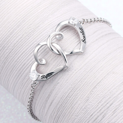 The memory of your loved one continues to color every day, their spirit glows forever in your heart. Now, this stunning Double Heart birthstone engraved name bracelet offers a comforting tribute to the everlasting bond you and your loved one share. Finely handcrafted and plated in shimmering sterling silver,this Bracelet features an exclusive design with heart by heart. On the bracelet heart pendant you can choice engraved any special words or name as your choice up to 8 characters. It is a trendy accent piece that you can wear any place, anytime.This is a thoughtful remembrance keepsake for the someone you loved. Don't wait. Order now!