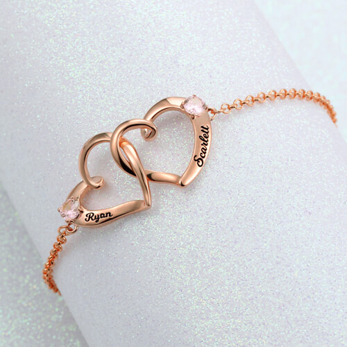 Custom Double Heart Engraved Name Bracelet In Rose GoldB229