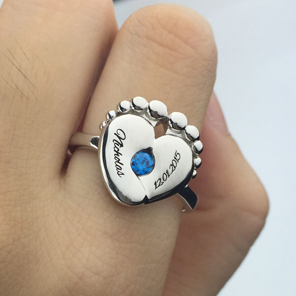 This baby foot ring is too cute for words, with the outline of two baby feet and a birthstone in the middle.You can engrave any words or date on the each side feet also support inside engraving .It is best gift for new mom celebrate the arrival of a new baby.