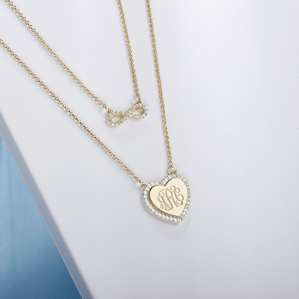 The Double Layered Necklace  is the perfect dainty necklace set for everyday wear! It gives off that effortless, chic look everyone is trying to achieve! This double-layered necklace makes a stylish statement. Fashioned in sterling silver, this design features the monogram pendant and infinity pendant full of Cubic Zirconia crystals. Two different pendants suspended in each chain. You can also personalized this necklace with any initials! This fashion necklace perfect for a birthday, anniversary, wedding, or just to celebrate someone (or something) very special.