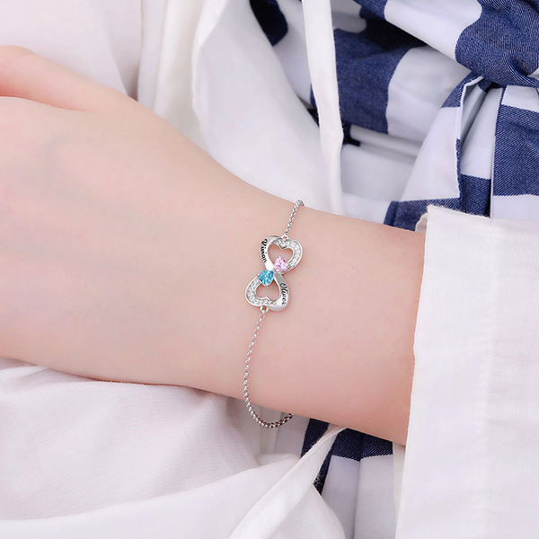 This fabulously women bracelet consists of two crystal studded hearts each facing opposite directions. With the addition of a knot design, it symbolizes the unique bond and infinity love between two people. Further, you can engrave names and choose birthstones on the bracelet to make it a one-of-a-kind jewelry for her. This is the perfect gift for a friend or partner and will absolutely make a fine addition to her wrist.
