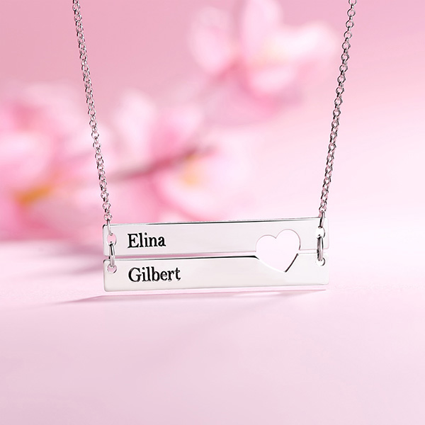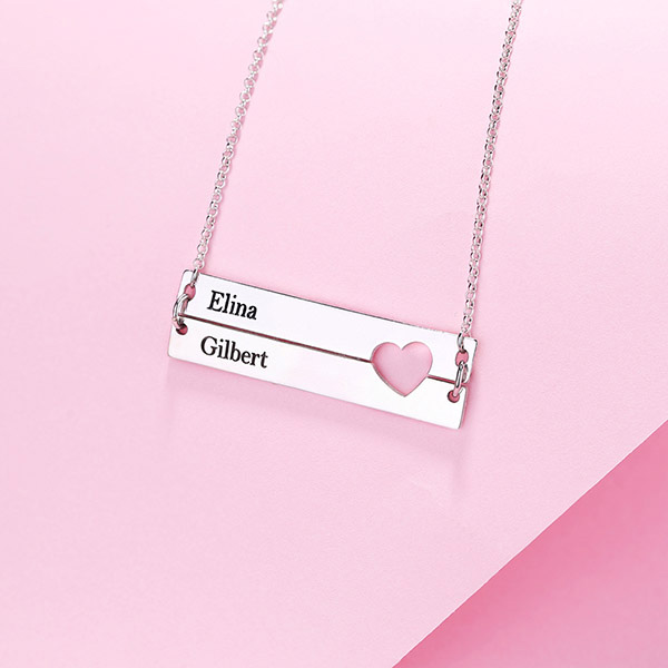 Featuring a cut-out heart detail that complements the two sleek, engravable bars, this necklace will add a touch of romance to any outfit. It's the perfect way to represent your significant other, or friends and family! Complete your one-of-a-kind necklace in your choice of Sterling Silver, gold or rose gold. The perfect gift for the love of your life to personalize the custom engraving.