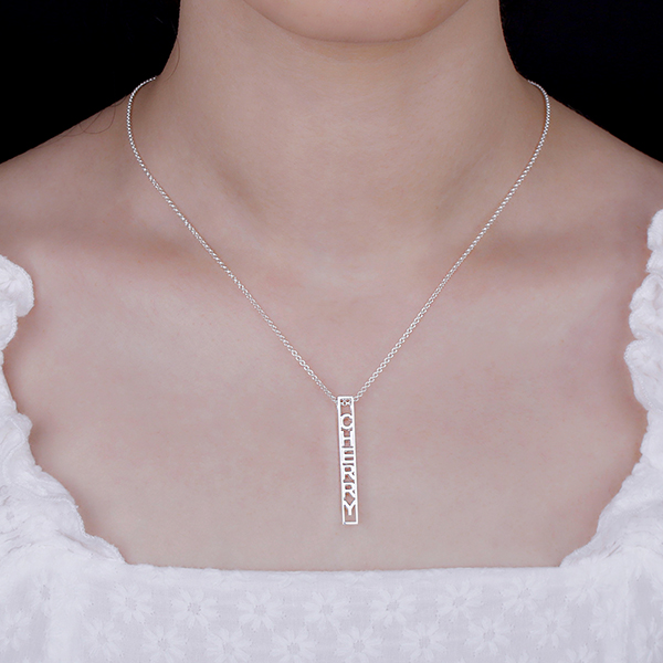 Custom necklaces are more popular than ever, and we’ve taken the trend to new heights! Our Personalized 3D Hollow Out Bar Necklace in Sterling Silver is perfect for sharing a name or a meaningful word. This necklace is made with sterling silver, and it hangs from a matching rolo chain. Like other custom bar necklaces from our collection, this stylish option is also available in your choice of 18K gold plating or 18K rose gold plating. A fun addition to your own jewelry box, it also makes an impressive gift for mom, grandma, or your best friend.