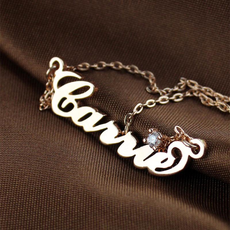 This Carrie Name Necklace in rose gold with a birthstone will prove to be a worthy buy. Choose your birthstone color and tell us if you’d prefer your gorgeous necklace in Sterling Silver 925. We can also make one or more for the name(s) of your choice.